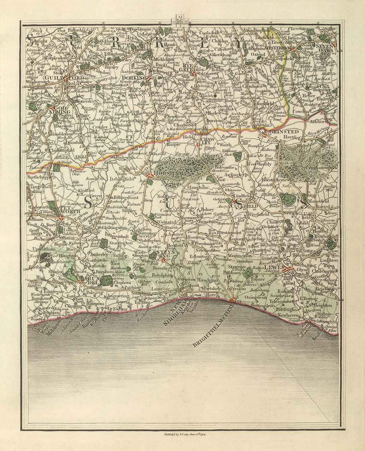 Cette merveilleuse vieille carte du Sussex et du Surrey a été publiée à l'origine en 1794. Elle a été créée par John Cary.