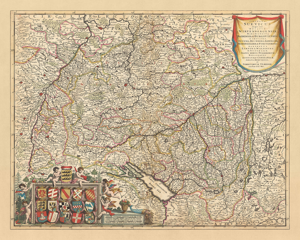 Le titre latin complet de la carte, « Circulus Suevicus in quo sunt Ducatus Wirtenbergensis, Marchionatus Badensis et Burgoviensis Comitatus Otting et Territorium Ulmense », se traduit par « Cercle souabe dans lequel se trouvent le duché de Wurtemberg, le margraviat de Bade et Burgau, le comté d'Oettingen. , et le territoire d'Ulm'. Ce titre décrit avec justesse les divisions politiques de la région à la fin du XVIIe siècle.