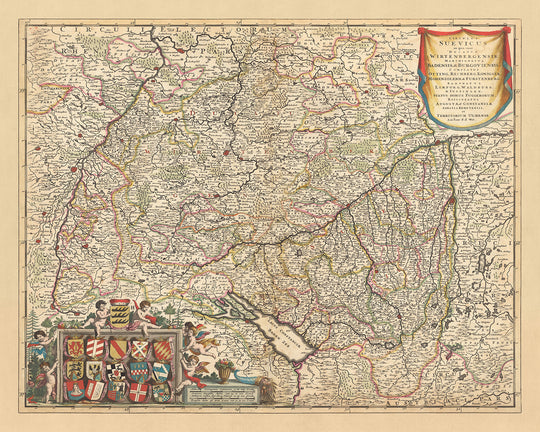 Plongez-vous dans les détails complexes de cette remarquable carte du cercle souabe datant de 1690, méticuleusement réalisée par le célèbre cartographe Nicolaes Visscher II. Ce morceau d'histoire remarquable met en valeur non seulement les prouesses géographiques de l'âge d'or néerlandais, mais également les paysages politiques et culturels de l'époque. Le Cercle souabe, connu sous le nom de « Circulus Suevicus » en latin, était un important cercle impérial du Saint-Empire romain germanique, englobant une grande partie de ce qui est aujourd'hui le sud de l'Allemagne.