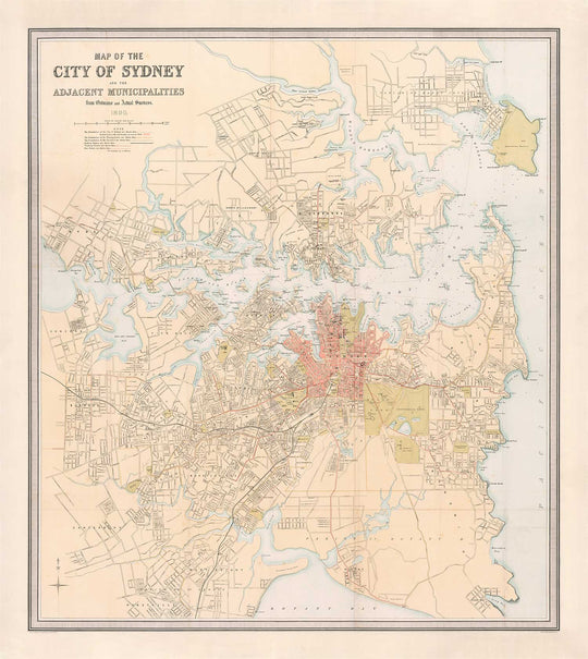 La carte présente un certain nombre de monuments et de quartiers importants, du quartier animé de Balmain à la sereine Botany Bay. La rivière Parramatta, une voie navigable majeure de Sydney, serpente à travers la carte, offrant un aperçu du lien vital de la ville avec l'eau. Plus loin sur la côte, Port Jackson, l'un des plus grands ports naturels du monde, est magnifiquement détaillé. La carte comprend également d'autres zones remarquables telles que Dawes Point, St Leonards, Glebe, Leichhardt, University Park, Newtown et Burwood, chacune ayant sa propre signification historique.