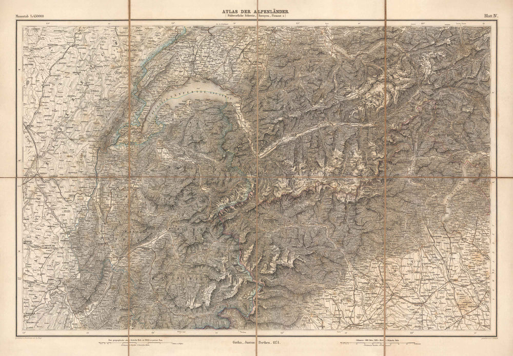 Mesurant plus de 190 000 km² et entourées de huit pays, les Alpes abritent certains des plus hauts sommets d'Europe. Cette carte est la feuille 4 sur 11 de "Mayr's Alpen-Atlas".