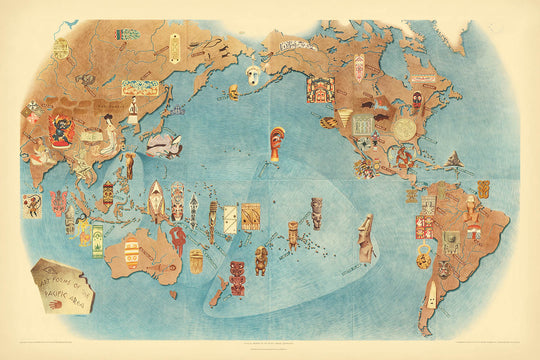 La projection cartographique de la carte englobe élégamment le vaste océan Pacifique, reliant les Amériques, l'Océanie et des parties de l'Asie dans un récit visuel sans couture. Ce contexte géographique souligne l'importance historique du Pacifique en tant que carrefour d'échanges culturels et d'interactions. Le travail de Covarrubias met non seulement en lumière les traditions artistiques de ces régions, mais sert également de rappel de l'interconnexion des cultures humaines.