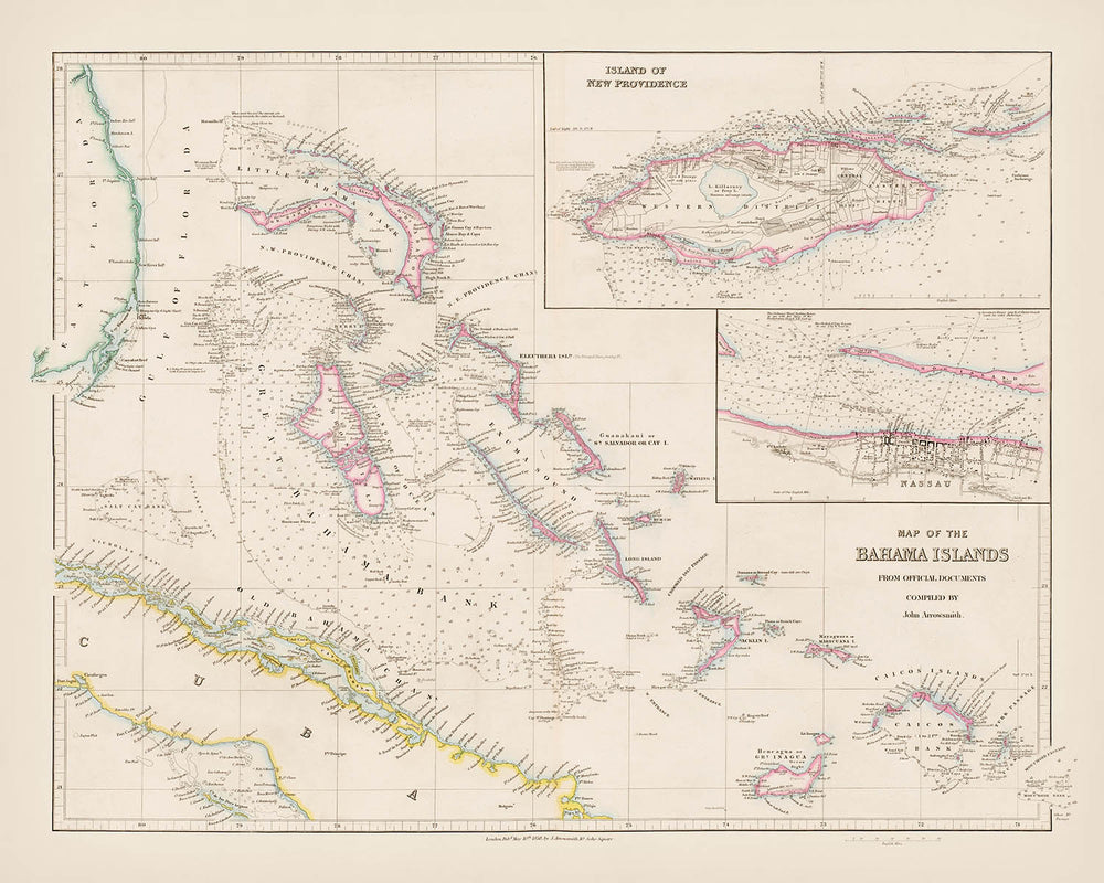 Ancienne carte des Bahamas par Arrowsmith, 1858: Nassau, New Providence, canaux, bancs, côtes