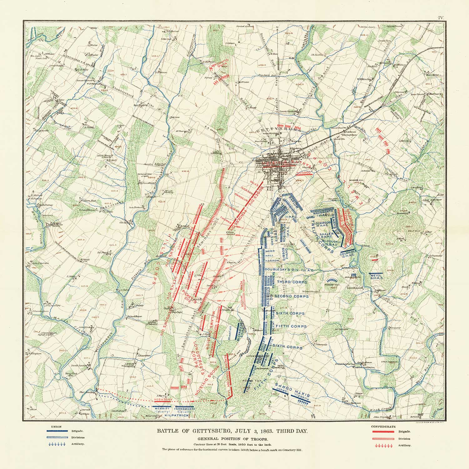 Cette carte montre la position de la Confédération et de l'Union le troisième jour du conflit, le 3 juillet 1863.
