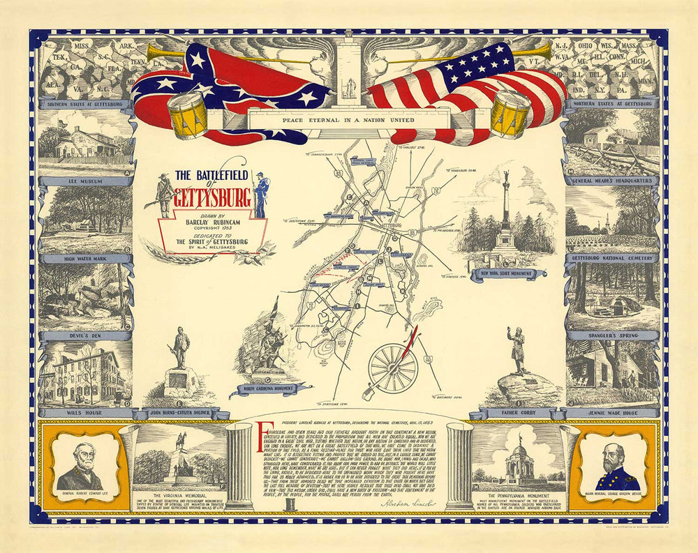 Cette merveilleuse vieille carte de la bataille de Gettysburg a été publiée à l'origine en 1953. Elle a été créée par Barclay Rubincam.