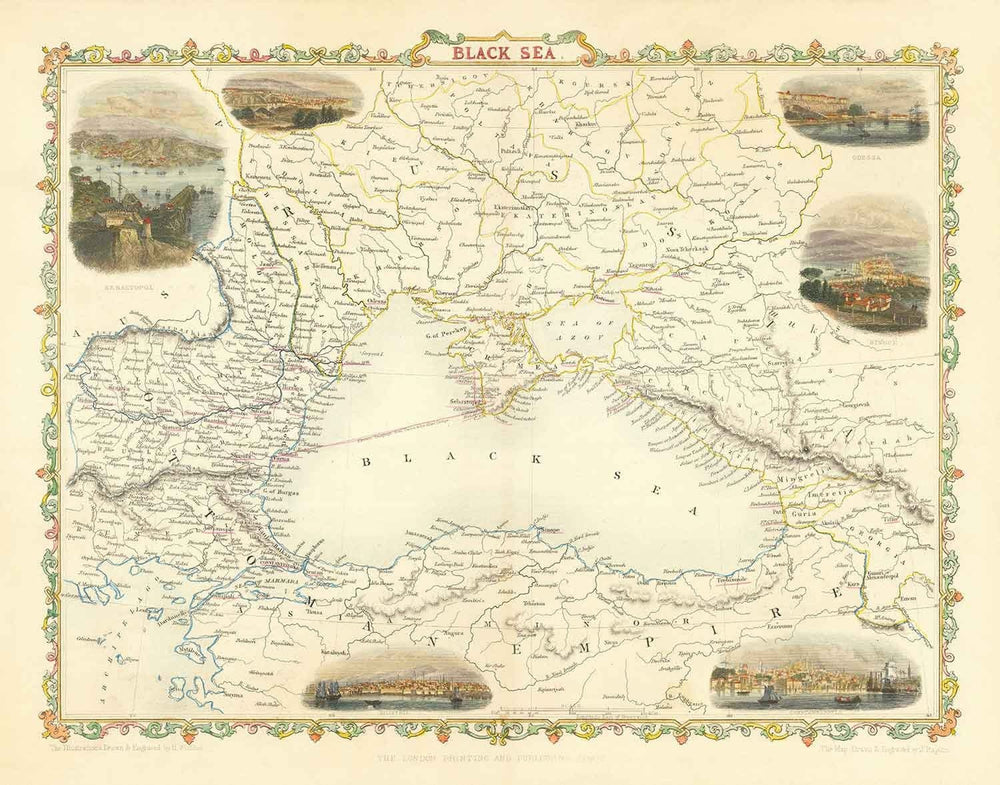 Gravé par John Rapkin et publié par J. Tallis & Co en 1854, c'est l'une des plus belles et des plus détaillées cartes historiques de la région de la mer Noire, avec l'Europe à gauche et l'Asie à droite.