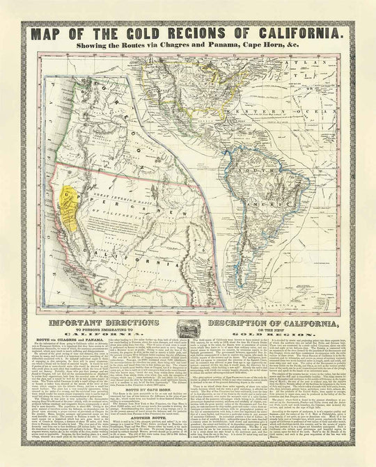 La carte présente beaucoup de détails et se concentre principalement sur l'état de Californie. À l'époque de la publication de la carte, la découverte de pépites d'or dans les vallées de Sacramento a déclenché la ruée vers l'or en Californie. Cela a entraîné l'arrivée de mineurs d'or de partout pour se rendre à San Francisco afin d'extraire le précieux métal, et un total de 2 milliards de dollars en or a été extrait.
