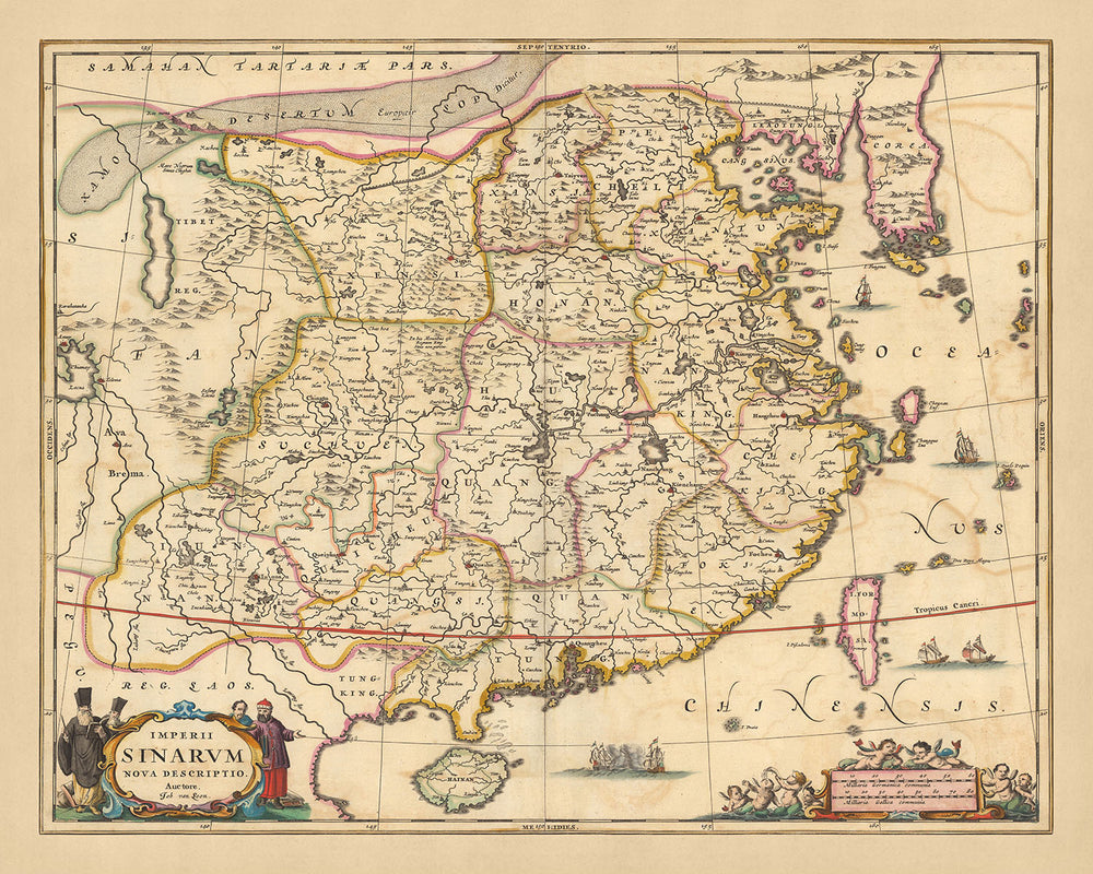 Plongez-vous dans la riche tapisserie de l'histoire avec « Imperii Sinarum Nova Descriptio Auctore Joh van Loon », un chef-d'œuvre cartographique remarquable de la fin du XVIIe siècle. Traduit en anglais, le titre de cette carte est « Nouvelle description de l'empire chinois par Joh van Loon ». Réalisée par Nicolaes Visscher II en 1690, cette carte témoigne de l'âge d'or de la cartographie néerlandaise, une période connue pour ses cartes précises et esthétiques. Visscher II, petit-fils du célèbre cartographe Claes Janszoon Visscher, perpétue la tradition familiale consistant à créer des cartes complexes et détaillées.