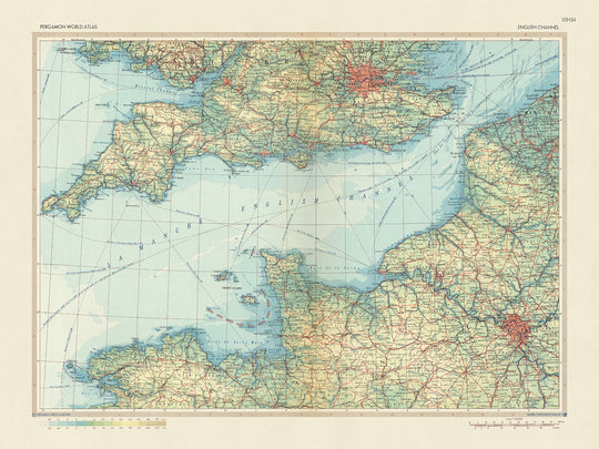 La représentation du sud de l'Angleterre sur la carte est complète et précise, capturant la topographie distincte et les frontières politiques de la région. La ville animée de Londres, avec sa riche histoire et sa diversité culturelle, est mise en avant, offrant un aperçu fascinant de l'agencement géographique de la ville durant le milieu du XXe siècle. De même, la représentation du nord-ouest de la France est également détaillée, avec un accent particulier sur la ville emblématique de Paris, connue pour son attrait romantique et sa grandeur architecturale.