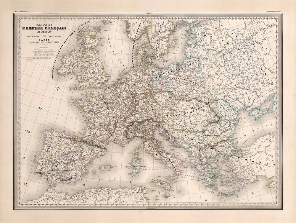 À première vue, la carte attire l'attention sur l'étendue de l'Empire français, couvrant non seulement la France, mais également certaines parties de l'Italie, de l'Espagne et même des îles britanniques. Pourtant, une inspection plus approfondie révèle une image plus complète de l’Europe, englobant d’autres régions importantes telles que l’Irlande, le Portugal, l’Allemagne, la Belgique, la Suisse, l’Autriche, la Pologne, la Russie, l’Ukraine et les Pays-Bas. Chaque pays est marqué avec une précision méticuleuse, démontrant l'engagement de Dyonnet envers l'exactitude et le détail.