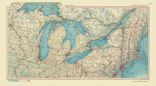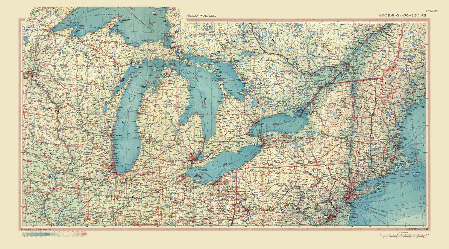 Ancienne carte des Grands Lacs, 1967: lac Michigan, lac Huron, lac Ontario, lac Érié et lac Supérieur.