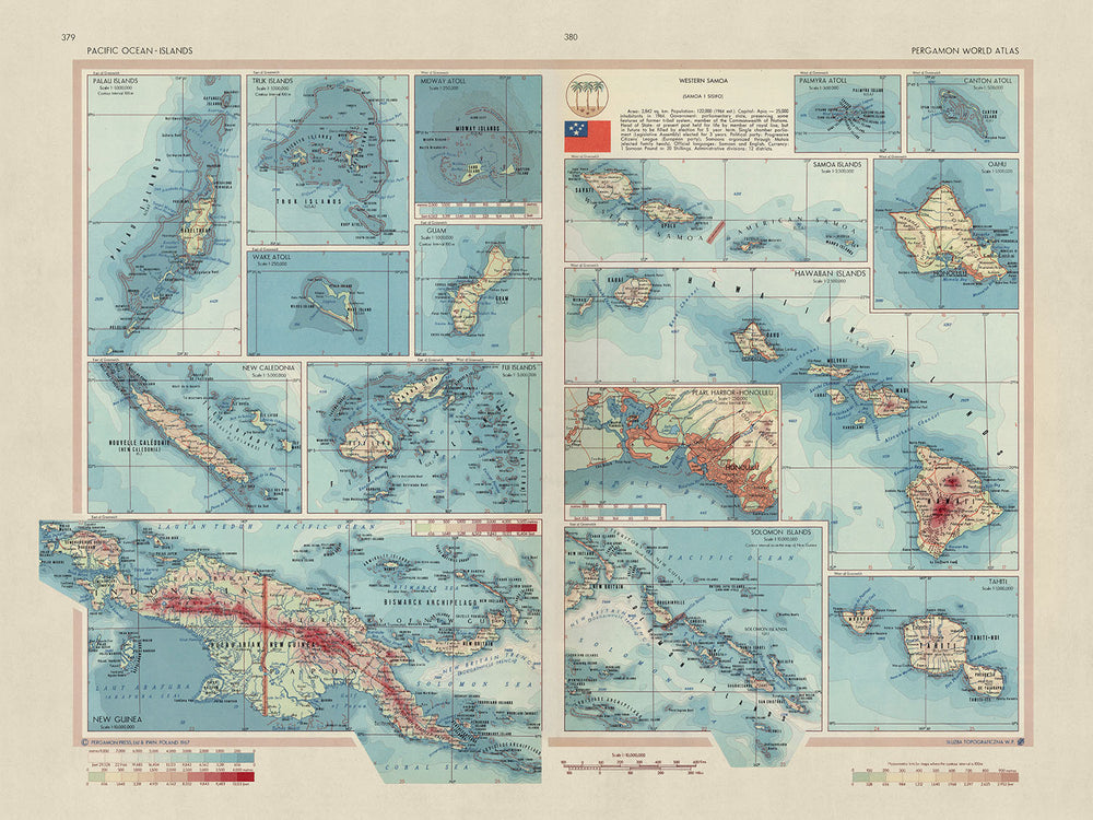 Ancienne carte des îles de l'océan Pacifique, 1967: Hawaï, Fidji, Palaos, Nouvelle-Guinée, Samoa, Pearl Harbour, Atolls