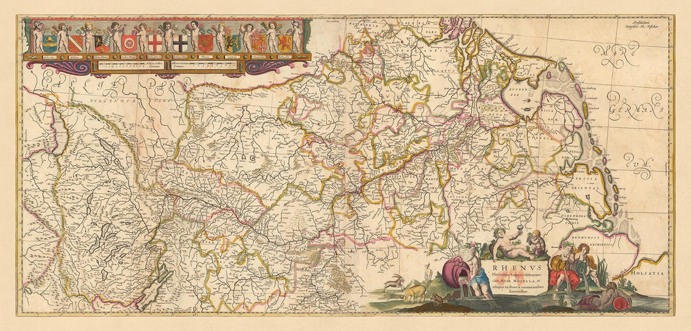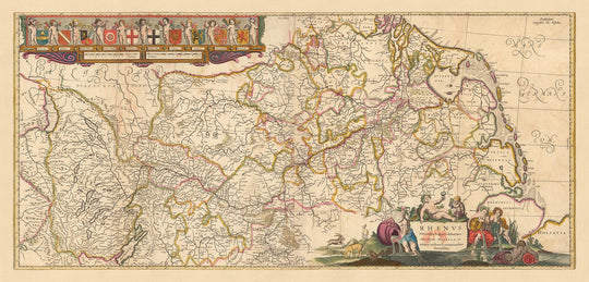 Ancienne carte du Rhin par Visscher, 1690 : De la bouche à la source, Berne, Bruxelles, Luxembourg, Francfort, Cologne