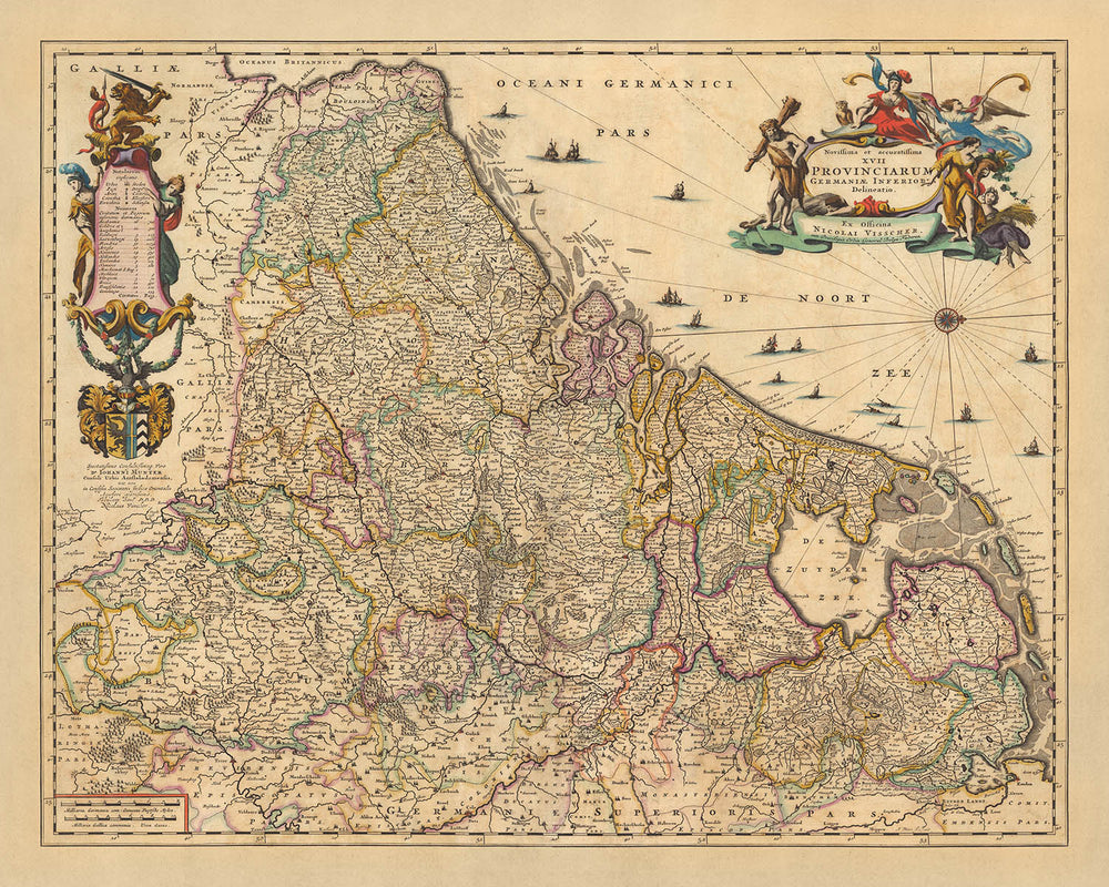 Plongez-vous dans la riche tapisserie de l'histoire avec cette carte complexe des dix-sept provinces, méticuleusement élaborée par Nicolaes Visscher II en 1690. La « Novissima et accuratissima XVII provinciarum Germaniae Inferioris delineatio » ou « La délimitation la plus récente et la plus précise des dix-sept provinces de La Basse-Allemagne offre un aperçu captivant des divisions politiques et géographiques des Pays-Bas de la fin du XVIIe siècle, qui englobent les Pays-Bas, la Belgique et le Luxembourg d'aujourd'hui.