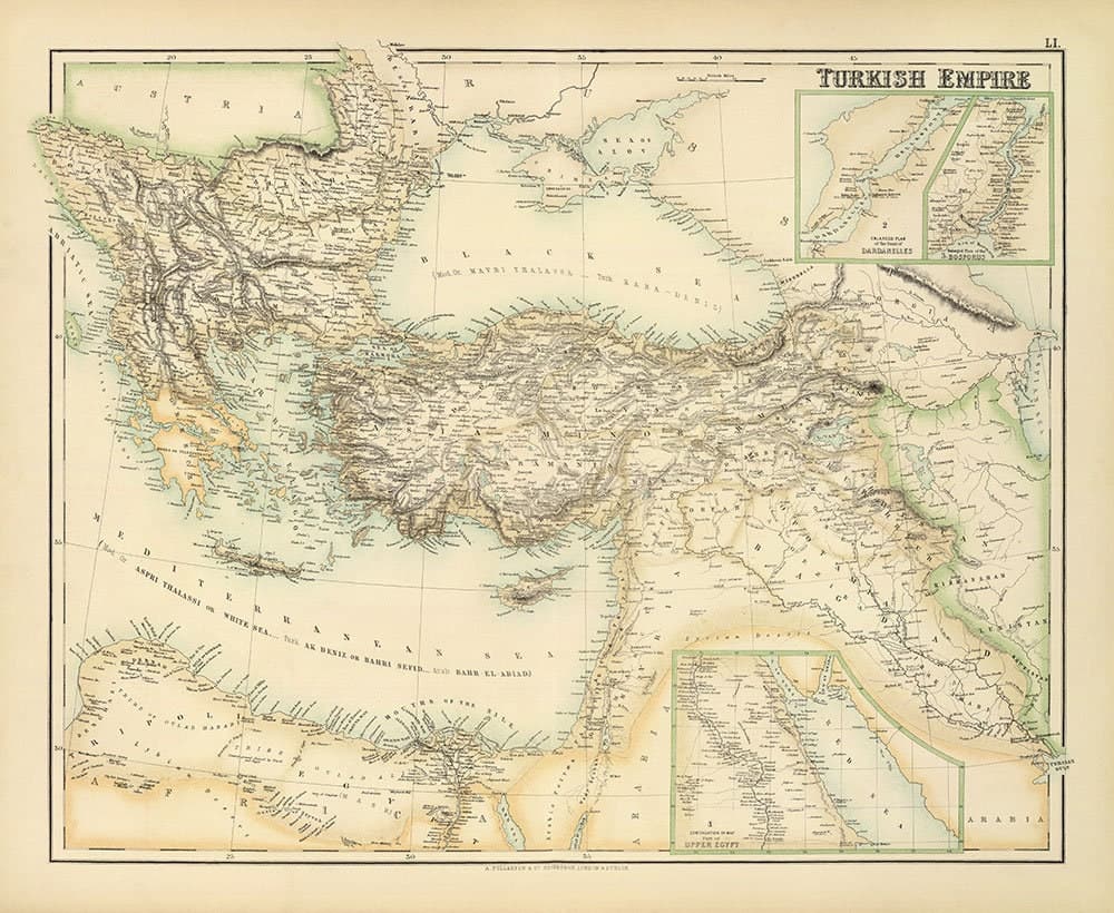 Cette vieille carte en couleur et merveilleuse montre l'étendue complète de l'Empire ottoman (appelé l'Empire turc sur cette carte), et ses pays environnants en 1872. Elle a été gravée par G.H. Swanston et publiée par A. Fullarton & Co.