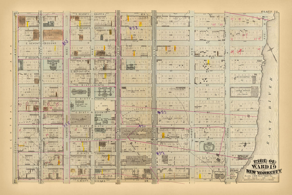 Cette magnifique carte de 1879, intitulée « Partie du quartier 19, New York City », est un joyau historique du cartographe GW Bromley. Il offre un aperçu incroyablement détaillé d'une partie de la Gold Coast, de Lenox Hill et de l'Upper East Side de New York à une époque de développement urbain important. La lithographie coloriée à la main révèle la disposition complexe des rues, des pâtés de maisons et des institutions remarquables, offrant ainsi un instantané unique du passé de la ville.