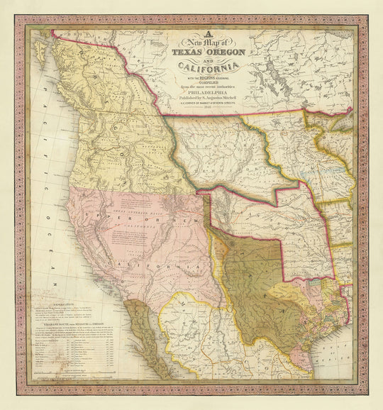 Cette merveilleuse vieille carte de l'Ouest des États-Unis d'Amérique, de la Californie, de l'Oregon et du Texas a été publiée pour la première fois en 1846. Elle a été créée par Samuel Mitchell.