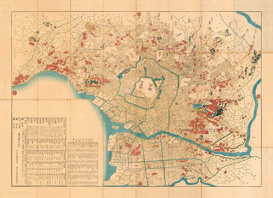 Cette carte de la capitale japonaise est étiquetée en écriture japonaise. Elle montre une vue très détaillée de la capitale telle qu'elle était dans la seconde moitié du 19ème siècle.