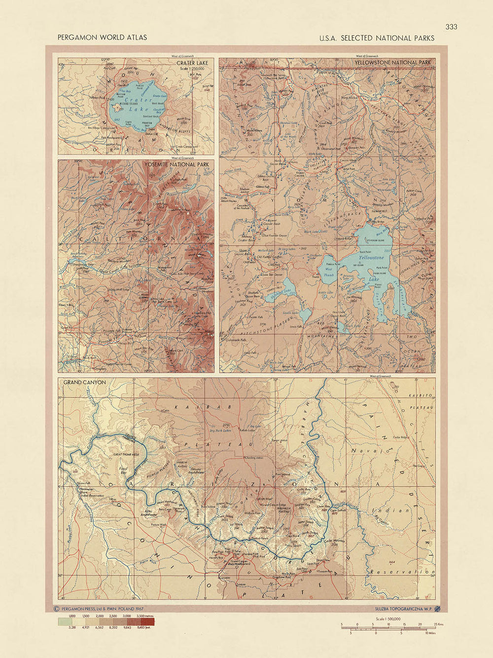 Présentation de "USA - Parcs Nationaux Sélectionnés", une carte infographique captivante publiée à l'origine en 1967 par le Service de Topographie de l'Armée Polonaise. Cette pièce remarquable sert non seulement d'outil de navigation mais aussi de fenêtre sur la grandeur du patrimoine naturel américain. Conçue avec une attention méticuleuse aux détails, elle propose une exploration approfondie de quatre parcs nationaux emblématiques : Yellowstone, Grand Canyon, Crater Lake et Yosemite. La carte de chaque parc est un témoignage des paysages uniques et des caractéristiques géologiques qui ont fasciné les visiteurs pendant des générations, rendue avec précision et clarté à une échelle de 1:250 000.