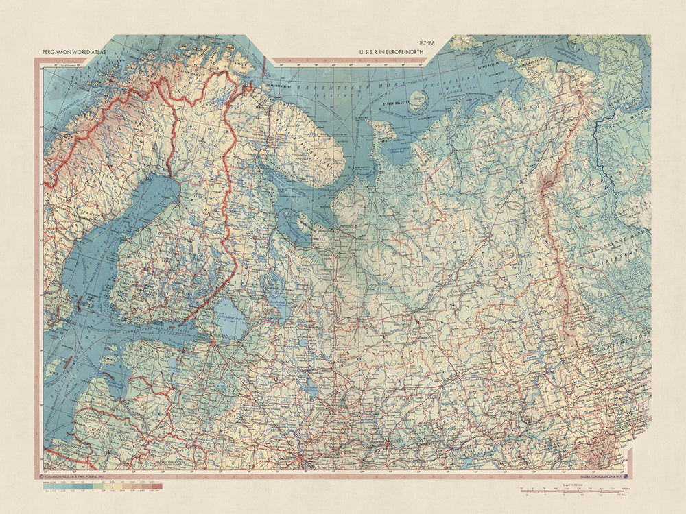 La carte 'URSS en Europe - Nord' est une carte politique et physique remarquablement détaillée, produit d'un artisanat méticuleux par le Service de topographie de l'Armée polonaise en 1967. Cette carte met en valeur la grandeur de la région nord de l'URSS en Europe, une entité géopolitique qui a exercé une immense influence au milieu du 20ème siècle. Elle capture l'immensité des régions nordiques de l'Union soviétique, s'étendant de l'Estonie et de la Lettonie à l'ouest aux vastes territoires de la Russie à l'est, et jusqu'aux points les plus au nord de la Finlande. Cette carte sert de document historique fascinant, offrant un aperçu du paysage politique et physique durant une époque charnière de l'histoire mondiale.