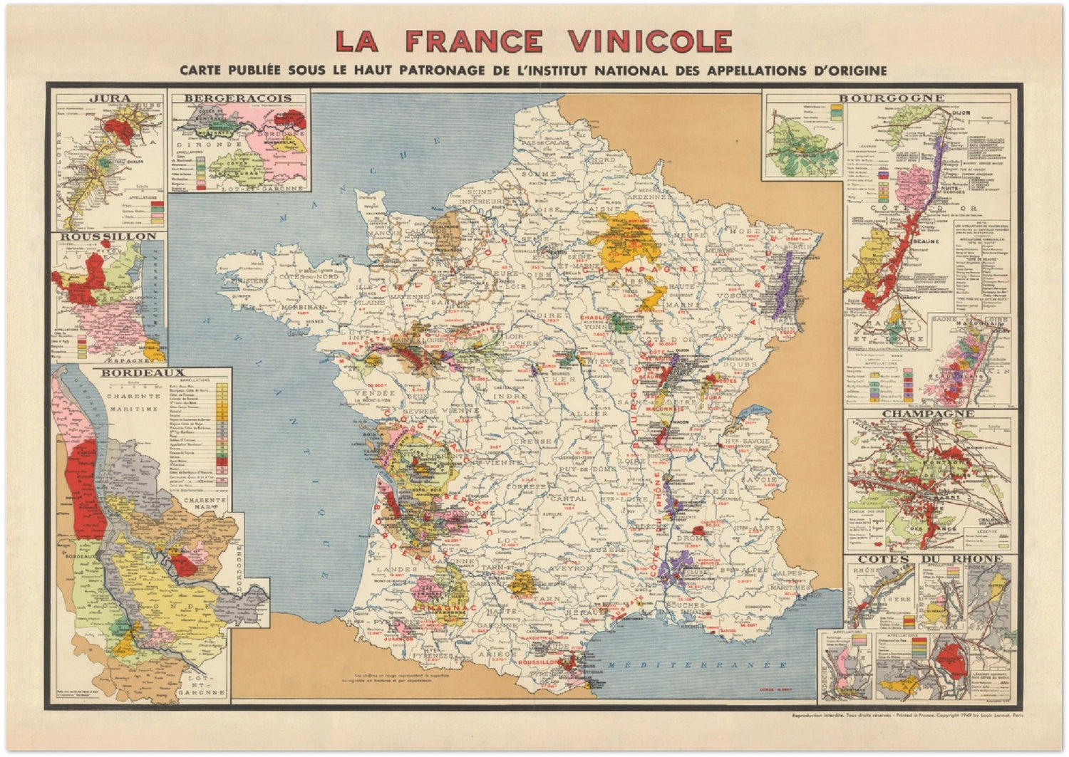 Ancienne carte des vignobles de France "La France Vinicole", 1939: Bordeaux, Bourgogne, Champagne, Côtes Du Rhône, Bergeracois