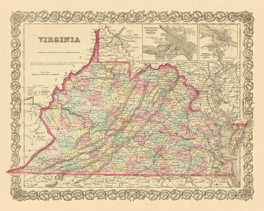 Plongez-vous dans la riche histoire des États-Unis avec cette superbe carte ancienne de la Virginie, réalisée par le cartographe estimé JH Colton en 1859. Colton est universellement reconnu comme l'un des meilleurs cartographes américains de son époque, et cette pièce témoigne de sa maîtrise. Ses cartes sont réputées pour leur précision et leurs détails, et cette carte de la Virginie ne fait pas exception.