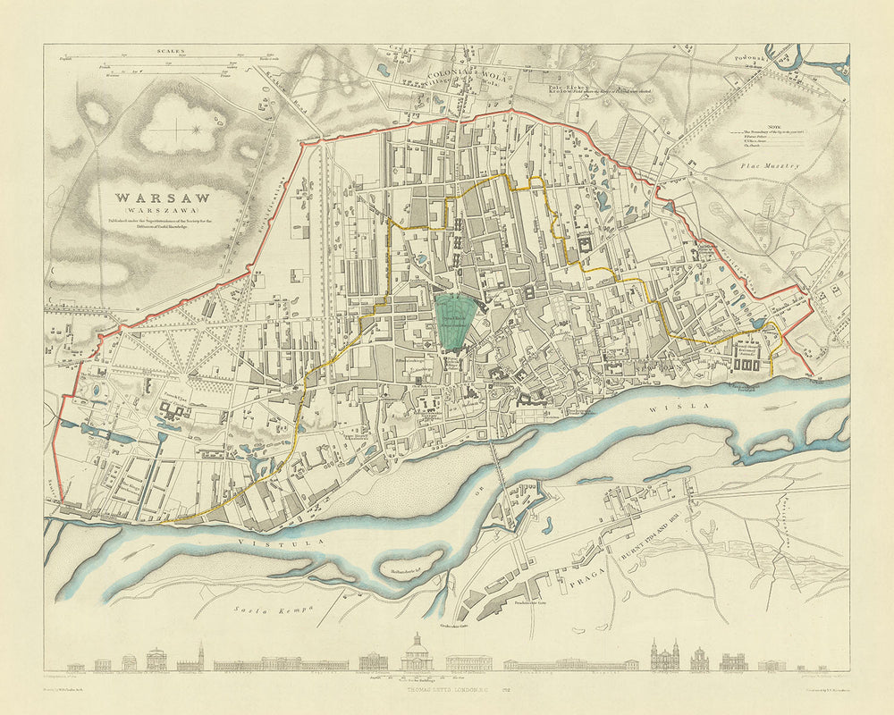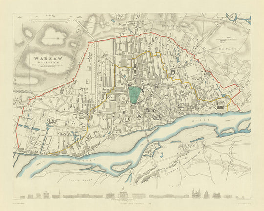 La signification géographique et stratégique de Varsovie est élégamment dépeinte à travers le rendu détaillé de la Vistule, qui divise la ville. Cette carte met en avant des ponts clés et des traversées de rivière qui ont historiquement joué des rôles cruciaux dans la défense et le développement de la ville. Entourant la rivière, la carte détaille minutieusement des quartiers comme Praga, connu pour sa culture vibrante et son passé tragique marqué par l'incendie de 1831 pendant la guerre polono-russe. L'inclusion de grands parcs tels que le parc Łazienki et le parc Saski offre un aperçu des vies récréatives des anciens habitants de Varsovie, mettant en valeur ces havres de verdure tels qu'ils étaient avant les dommages étendus du 20ème siècle.