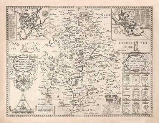 Dans le coin supérieur gauche se trouve une gravure détaillée de Warwick, alors (et toujours) la capitale de ce comté ancien. En haut à droite se trouve une jolie gravure de Coventry, ou Coventree comme on l'appelait à l'époque.