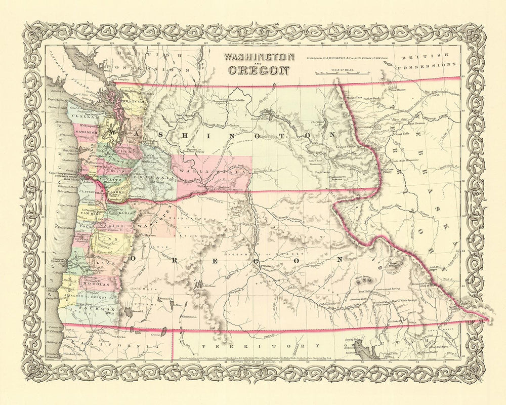 Plongez-vous dans la riche histoire des États-Unis avec cette superbe carte ancienne de Washington et de l'Oregon de 1859, réalisée par le cartographe estimé JH Colton. Connu pour son attention méticuleuse aux détails et la qualité exceptionnelle de son travail, Colton est largement reconnu comme l'un des meilleurs cartographes américains de son époque. Cette carte témoigne de son talent et de son dévouement, offrant un aperçu fascinant du passé.