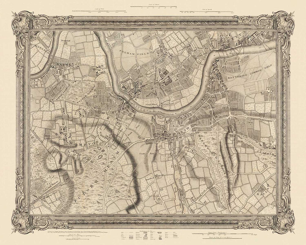 Ancienne carte de l'ouest et du sud-ouest de Londres en 1746 par John Rocque: Fulham, Wandsworth, Chelsea, Putney, Battersea, SW3, SW6, SW10, SW11, SW13, SW15, SW18