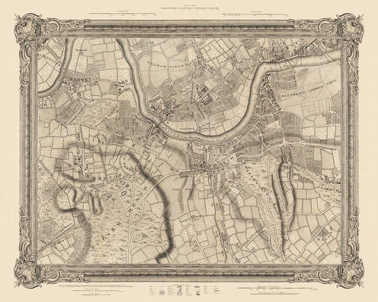 Rocque a publié deux grandes cartes de Londres. Cette carte ici est une feuille unique d'une très belle carte de 16 feuilles de "Londres et 10 miles autour". Son autre carte, une carte de 24 feuilles du centre de Londres avec un détail magnifique, est beaucoup plus célèbre.