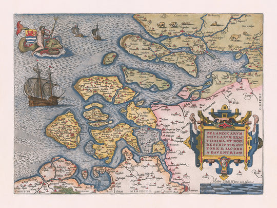 Ancienne carte de Zélande par Ortelius, 1584 : Rotterdam, Anvers, Delft, Triton, voiliers