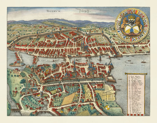La carte elle-même est assez saisissante, avec la rivière Limmat, les ponts et le lac de Zurich dominant le milieu du cadre. Vous reconnaîtrez également d'autres parties de la ville, comme les églises. Cependant, l'imposante muraille de la ville a été démolie dans les années 1800.