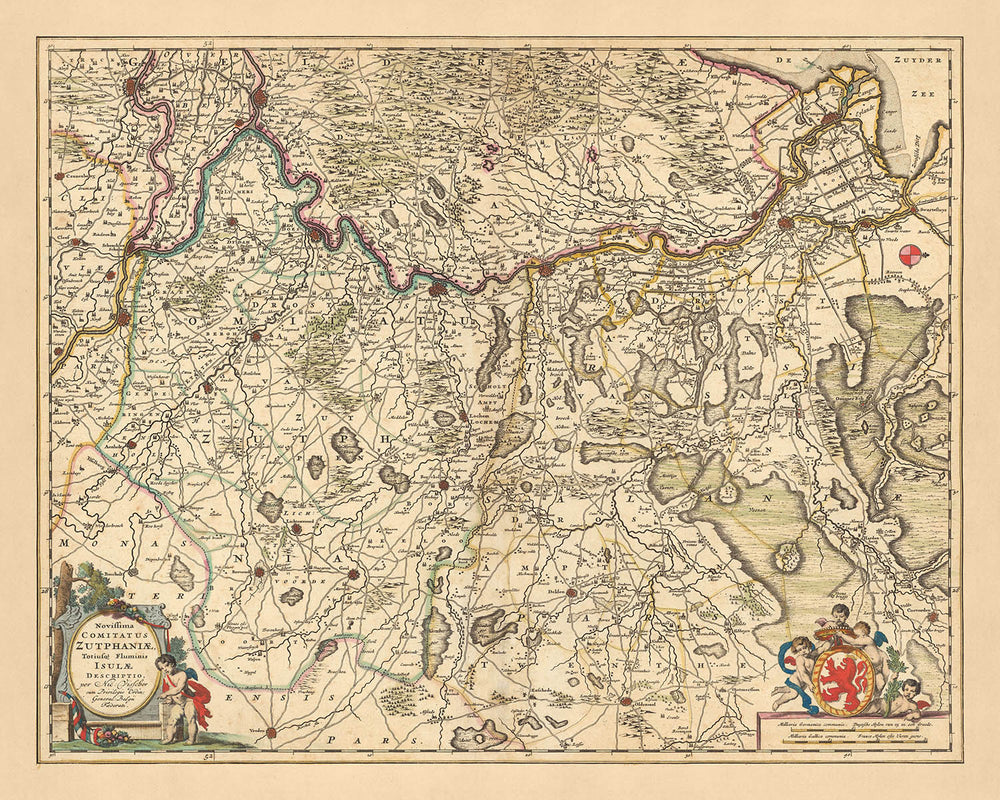 Ancienne carte de Zutphen par Visscher, 1690 : Apeldoorn, Arnhem, Nimègue, Deventer, parc national De Hoge Veluwe