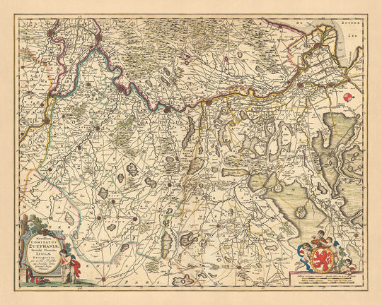 Cette carte n'est pas seulement une représentation géographique mais aussi un document historique, offrant un aperçu des divisions politiques et des frontières régionales de l'époque. La représentation détaillée du comté de Zutphen et de l'ensemble de l'île fluviale offre un aperçu fascinant de l'âge d'or néerlandais, faisant de cette carte un ajout précieux à toute collection. Explorez le paysage historique des Pays-Bas à travers les yeux de Nicolaes Visscher II et appréciez le talent artistique et la précision nécessaires à la création de cette magnifique carte.