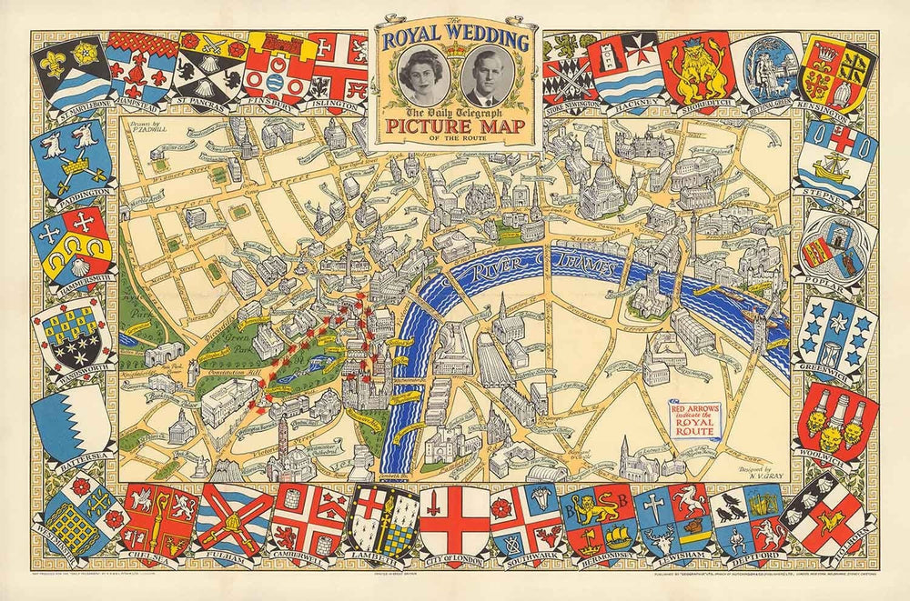 Publié dans le Daily Telegraph en 1947, ceci est bien sûr une carte picturale de l'itinéraire emprunté par la Reine Elizabeth II et le Prince Philip le jour de leur mariage - de l'abbaye de Westminster, en passant par Whitehall, jusqu'à The Mall et au palais de Buckingham, puis de retour à l'abbaye.