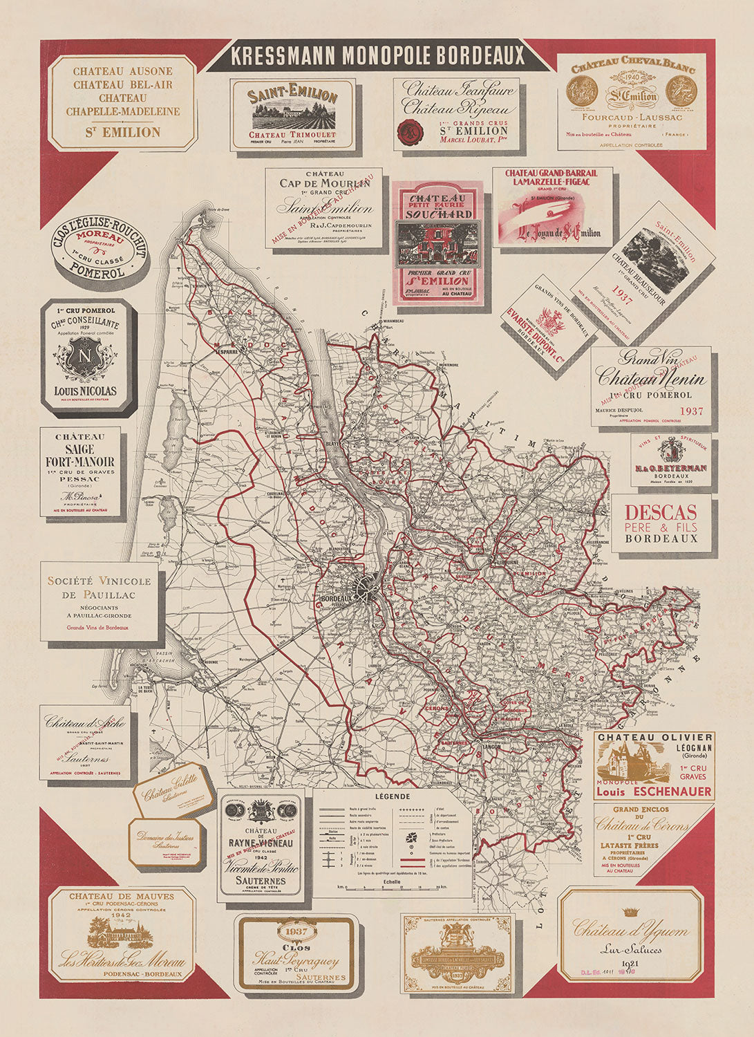 Carte Ancienne Carte des Vins de Bordeaux en 1948: Garonne, Pessac, Blanquefort, Carbon-Blanc, Libourne