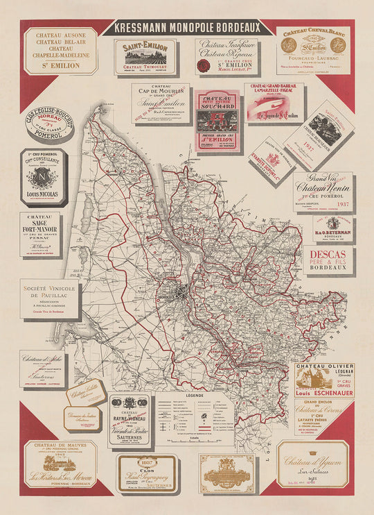 Ce qui rend cette carte particulièrement intéressante, c'est son contexte. Publié en 1948, il reflète une époque où Bordeaux se remettait des ravages de la Seconde Guerre mondiale et commençait à rétablir sa réputation de leader mondial de la production de vin. La carte sert ainsi non seulement de guide géographique mais aussi de document historique, mettant en lumière un moment charnière de l'histoire de la région. Du sommelier chevronné à l'amateur de vin occasionnel, cette carte offre une occasion unique de plonger plus profondément dans la riche tapisserie du patrimoine viticole bordelais.
