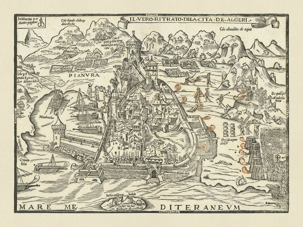 Ancienne carte militaire du siège d'Alger en 1541 par Pagano: Alger, Mandrachio, Castel Vechio, stratégie navale, Empire ottoman