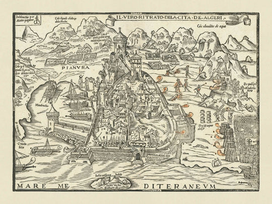 La signification historique de la carte est sans pareille, car elle fournit un aperçu des stratégies militaires et des défis rencontrés pendant le siège. La représentation d'Alger, avec ses murs fortifiés et ses camps militaires stratégiques, illustre les préparations et manœuvres intenses entreprises par les forces de Charles V. La présence de navires dans le port met en évidence l'aspect naval de la campagne, tandis que le terrain environnant et les caractéristiques naturelles ajoutent de la profondeur au récit de cet événement historique. Cette carte n'est pas seulement une représentation géographique mais un chef-d'œuvre narratif qui capture le drame et la complexité de la guerre au XVIe siècle.