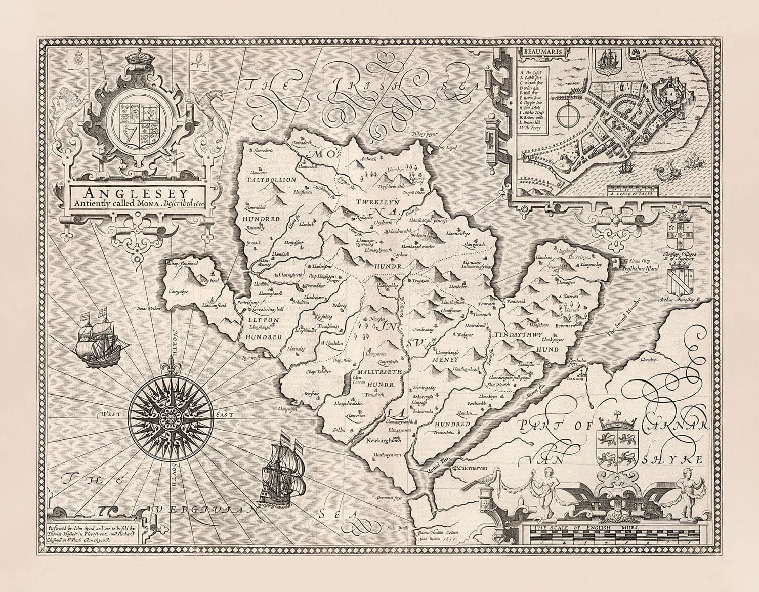 En haut à droite se trouve une gravure détaillée de Beaumaris, alors chef-lieu du comté d'Anglesey.
