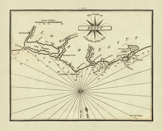 Le design de la carte est à la fois fonctionnel et esthétiquement plaisant, présentant une rose des vents classique et une échelle de miles qui illustrent les normes cartographiques de l'époque. Ces éléments ajoutent non seulement à l'utilité de la carte mais aussi à son charme, capturant l'essence de l'exploration maritime durant la période. Le traçage soigné des embouchures du Nil et de la topographie environnante offre un portrait vivant de la géographie de la région, en faisant un outil éducatif précieux pour ceux qui s'intéressent à l'histoire naturelle et politique de la zone.