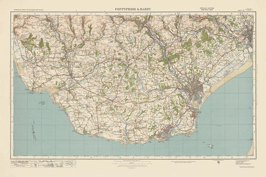 Carte Old Ordnance Survey, feuille 109: Pontypridd & Barry, 1925 : Cardiff, Bridgend, Porthcawl, Newport et Caerphilly