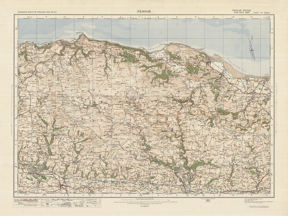 Carte Old Ordnance Survey, feuille 119: Exmoor, 1925 : Minehead, South Molton, Dunster, Watchet, Foreland Point