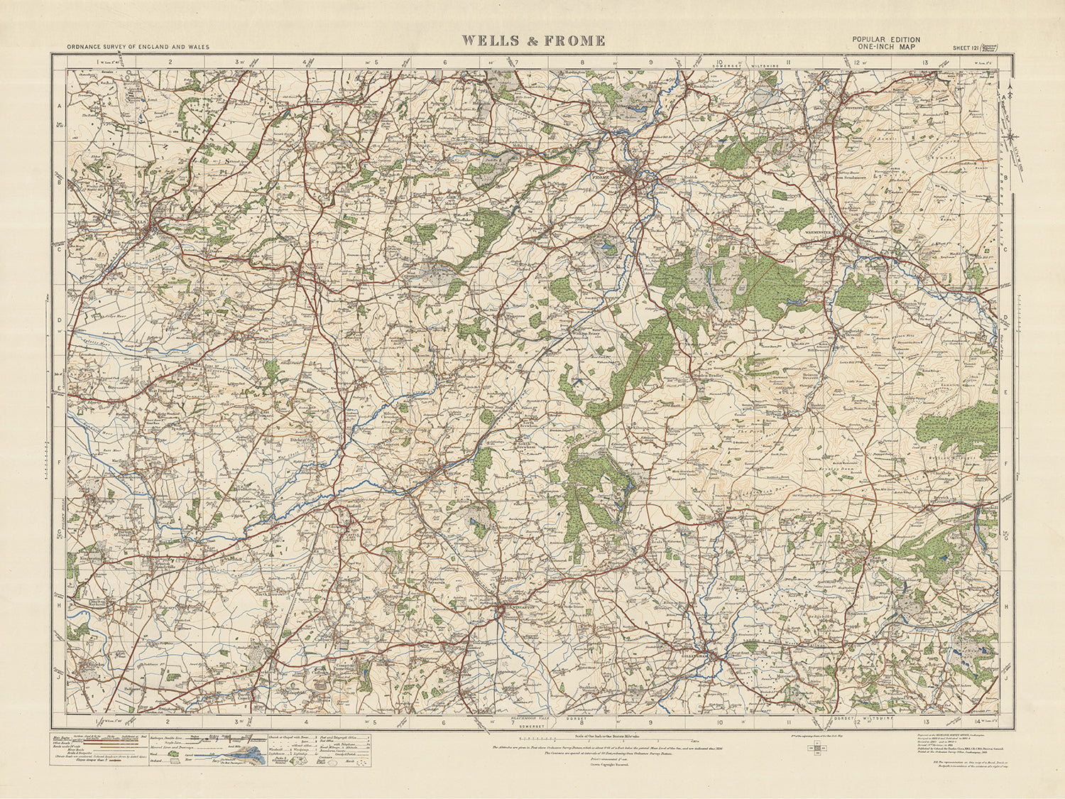 Cette carte vintage, intitulée « Feuille 121 - Wells & Frome », est une pièce précieuse de l'édition « populaire » d'un pouce de l'Ordnance Survey, Angleterre et Pays de Galles, publiée en 1925. La carte présente diverses villes et caractéristiques intéressantes, notamment Wells & Frome, Warminster, Westbury, Gillingham, Shepton Mallet et la zone de beauté naturelle exceptionnelle de Cranborne Chase (AONB).