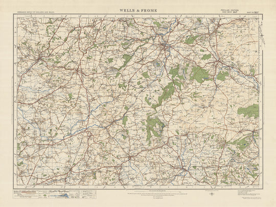 Plongez-vous dans la riche histoire et les paysages captivants de Wells, Frome et de leurs environs avec cette carte vintage méticuleusement détaillée de 1925.