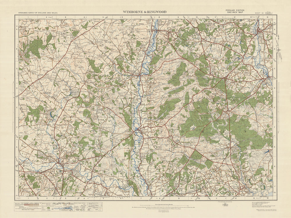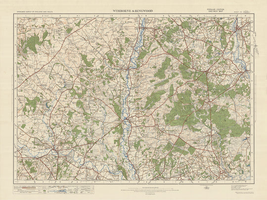 Cette carte vintage, intitulée « Feuille 131 - Wimborne & Ringwood », fait partie de l'édition « populaire » d'un pouce de l'Ordnance Survey de l'Angleterre et du Pays de Galles, publiée en 1925. La carte présente les villes de Wimborne et Ringwood, ainsi que plusieurs autres des colonies et des monuments fascinants. Il offre un aperçu unique du passé, vous permettant d'explorer la région telle qu'elle était il y a près d'un siècle.