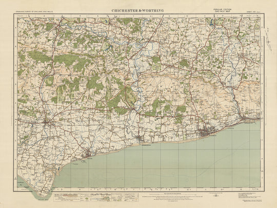 Cette carte vintage, intitulée « Feuille 133 - Chichester & Worthing », fait partie de l'édition « populaire » d'un pouce de l'Ordnance Survey de l'Angleterre et du Pays de Galles, publiée en 1925. Elle offre un aperçu fascinant du passé, mettant en valeur les villes, , et des caractéristiques intéressantes de la région de Chichester et Worthing. La carte couvre une région riche en histoire, située dans le comté historique de Sussex.
