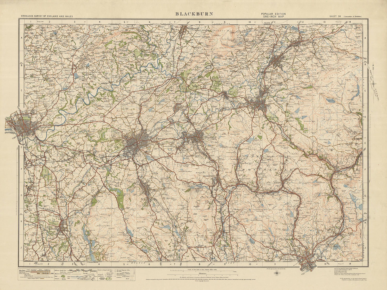 Ancienne carte de l'Ordnance Survey, feuille 30: Blackburn, 1925 : Preston, Burnley, Clitheroe, Accrington, Chorley