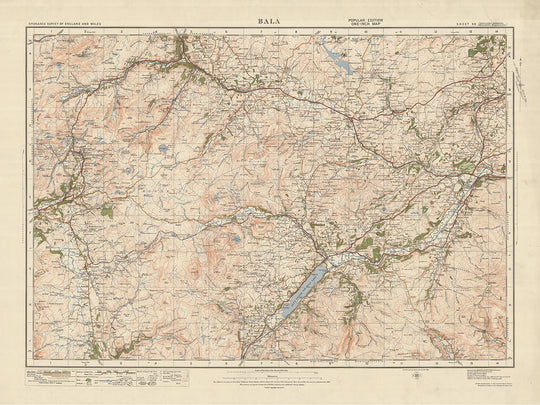Carte Old Ordnance Survey, feuille 50: Bala, 1925 : Corwen, Blaenau Ffestiniog, Trawsfynydd, parc forestier Coed y Brenin, parc national d'Eryri (Snowdonia)